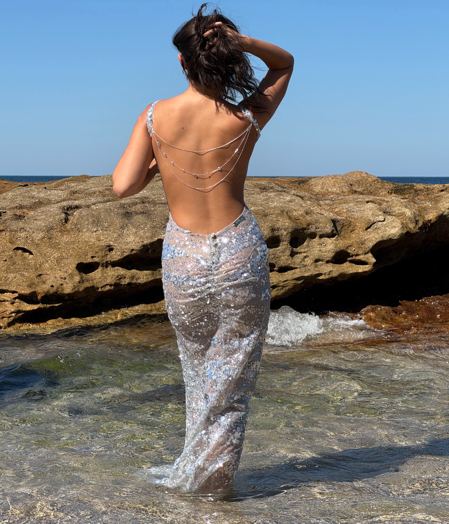 A back chain, often referred to as a back necklace or back body chain, is an innovative piece of jewellery that adorns the back while highlighting your silhouette beautifully. It's a vibrant way to add glamour and allure to your outfit, making it a must-have accessory for fashion-forward individuals.