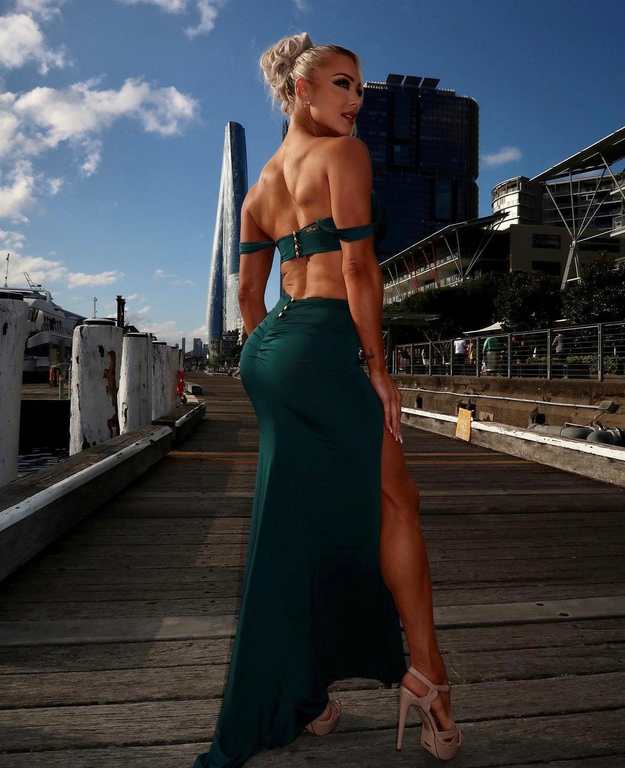 Turn heads in the stunning Charlie’s Angels set with the Charlie Top featuring an elegant cowl neck design at the bust which is draped off the shoulder sleeves. Showcasing our signature gold buttons. Splendor is not a question with our newest evening skirt the Bella Skirt. Handcrafted from Amy Taylor's signature figure forming fabric, the high waisted skirt highlights all female silhouettes. With a sultry leg split that elongates and elevates/span>