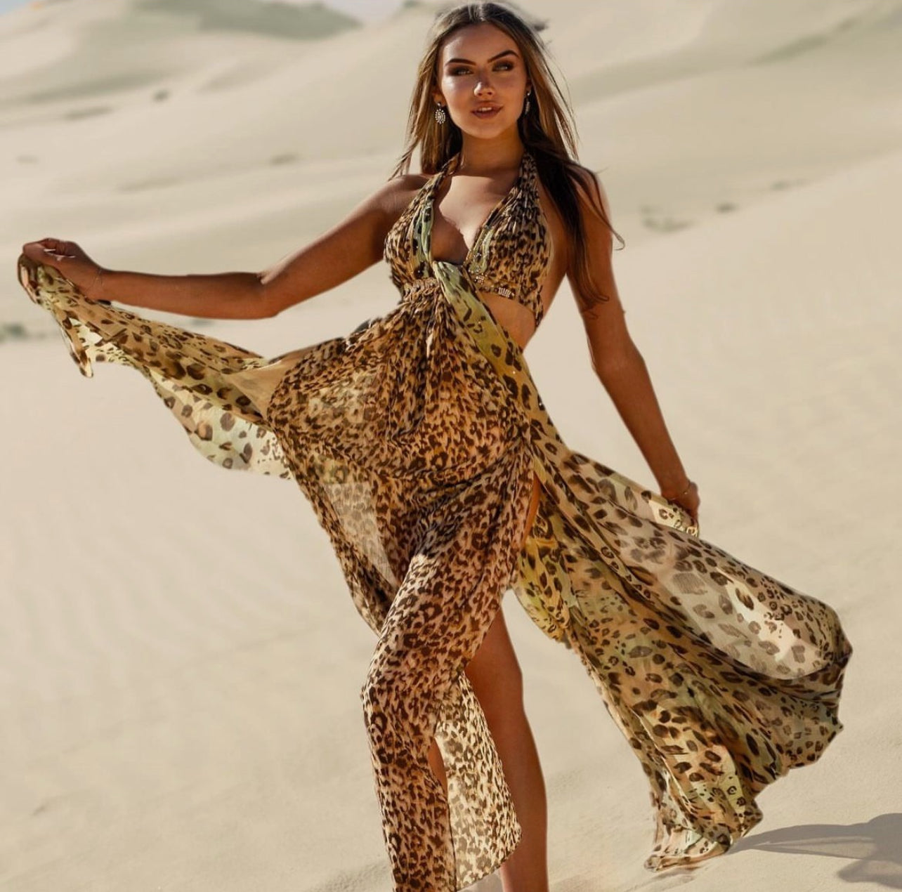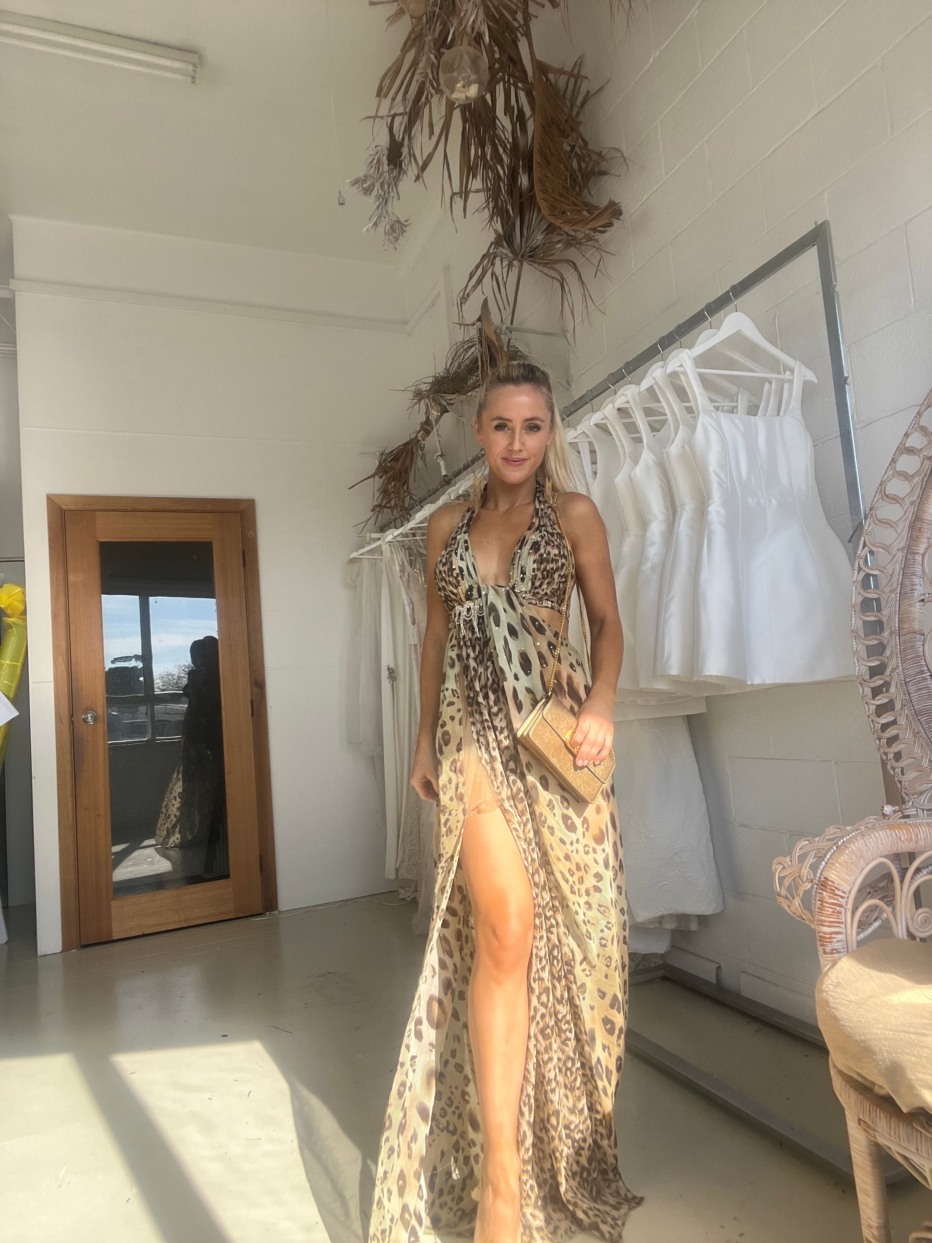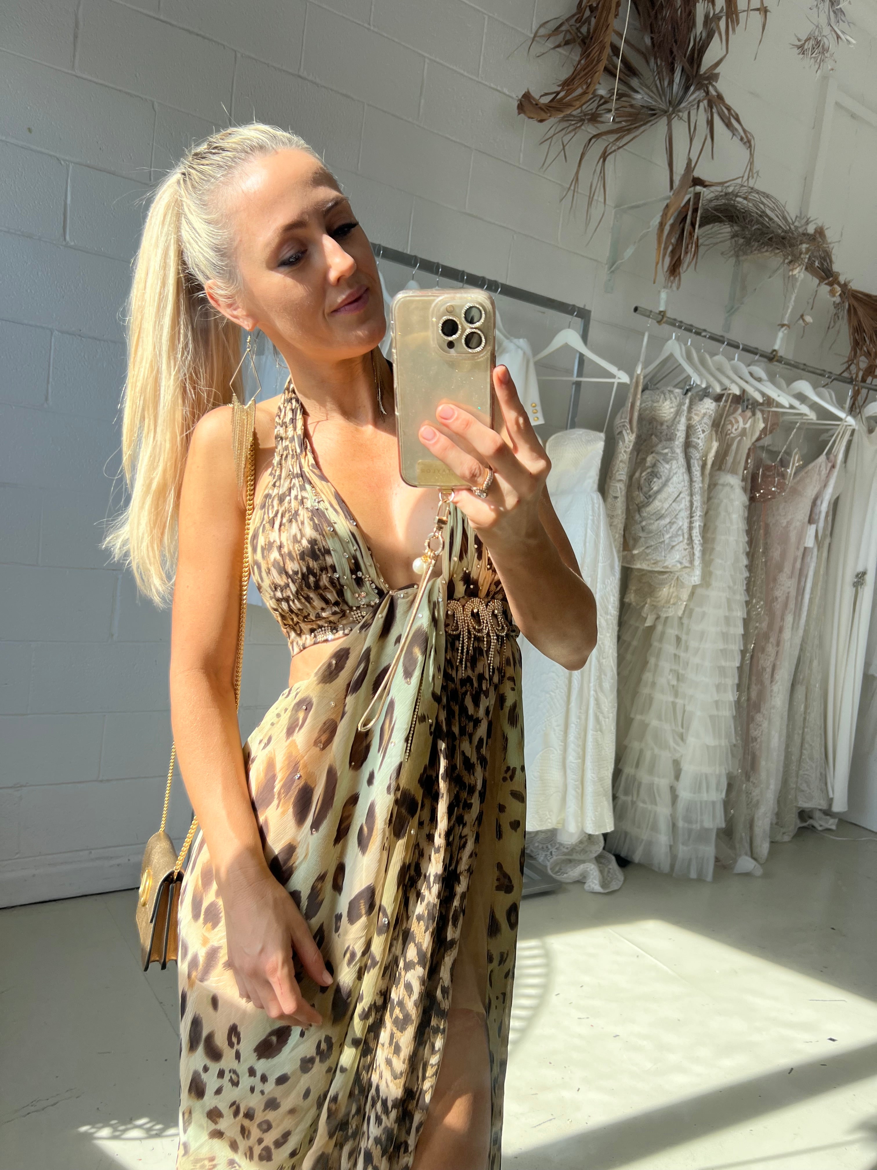 The TayMilla Dress is one of a kind. This flowy dress features a high split and our signature low back. It has an adjustable tie up back detail making it adjustable to your body shape. It comes in one size to fit XS-L. Complete the look with gold accessories and strappy heels for a summer Goddess vibe. The TayMilla Dress fits size XS-L