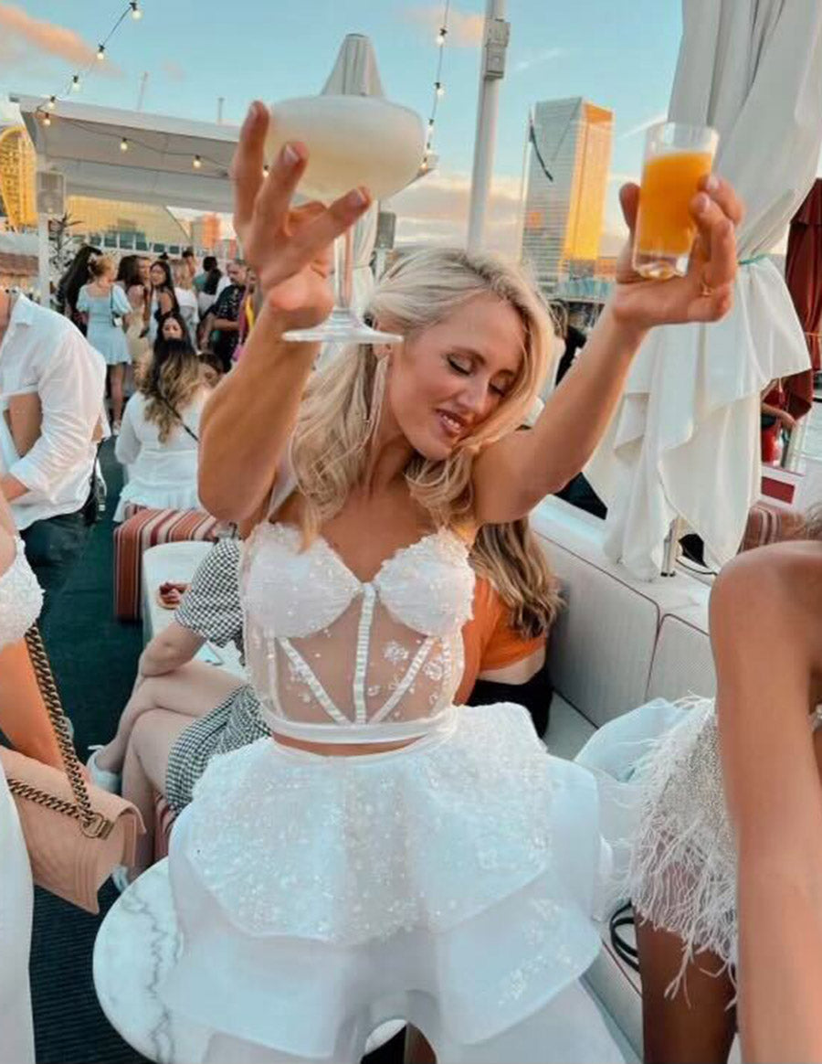 This outfit is perfect for a bridal shower, hens or birthday! The corset top is made to complement the shape of the body with boning and mesh along the torso. This piece has been delicately hand beaded with tulle fabric for straps. The corset & skirt are a perfect match with a tight fitting top, & skirt that flares out creating the perfect silhouette. The top layer of the skirt has also been hand beaded, along with hand stitched Swarovski crystal buttons.