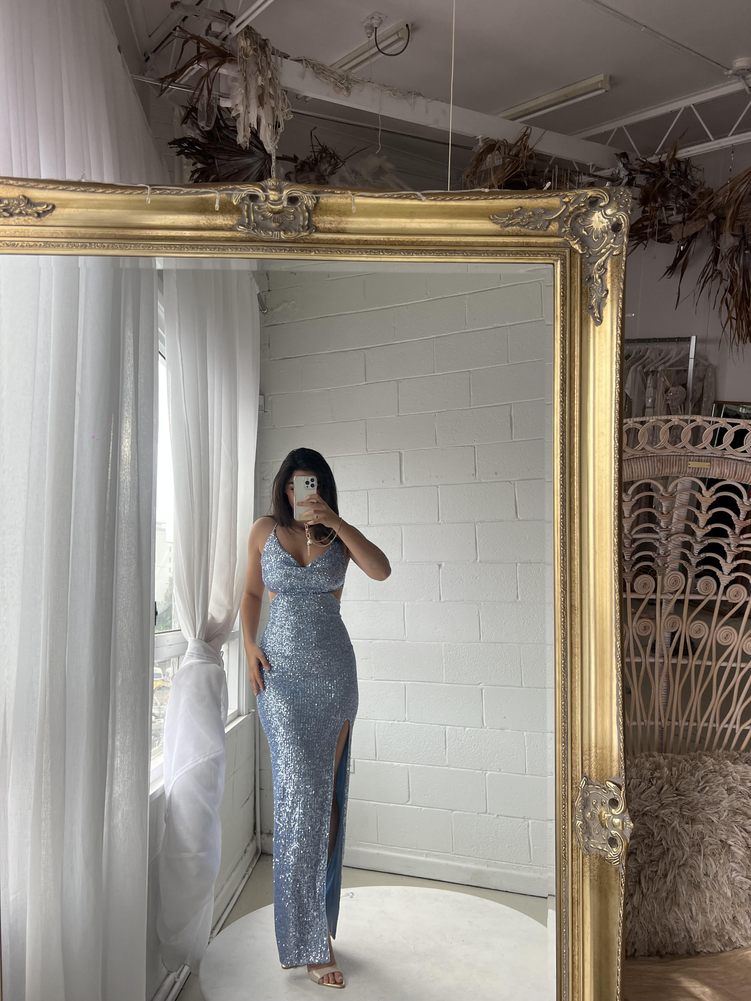 Sparkle and standout in our Siren Gown. This gorgeous piece features a cowl neckline, leg split and adjustable tie up back. The fabric is fully lined and super flattering, curated to hug all your beautiful curves and make you feel like an absolute goddess.
