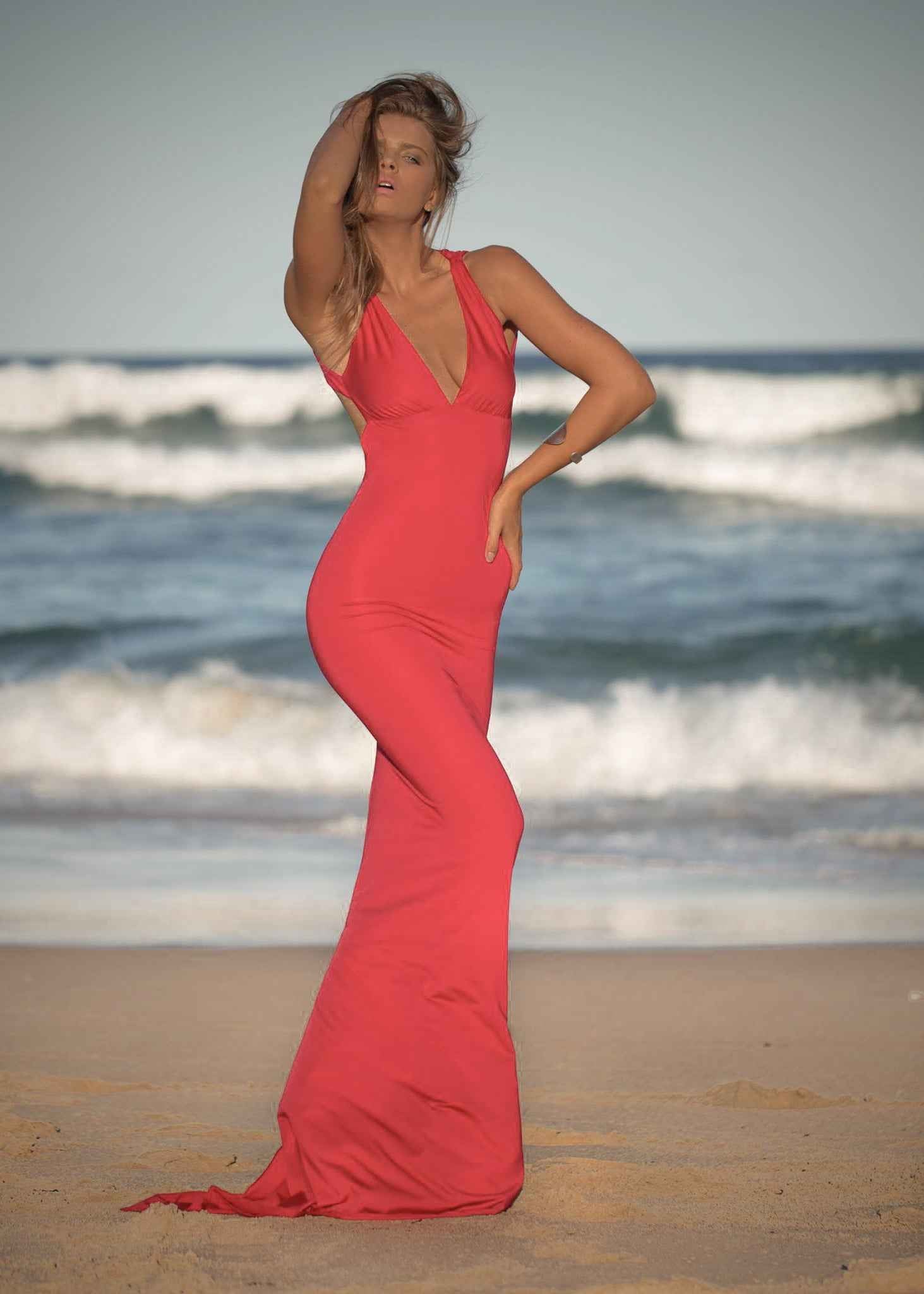 The latest edition to Amy Taylor's signature collection. Fall in love with the Arianna Gown which features a plunging neckline and adjustable front ties. This gown will have you feeling effortlessly gorgeous with the flattering keyhole button up back and Amy Taylor's signature gathered lower back detailing.