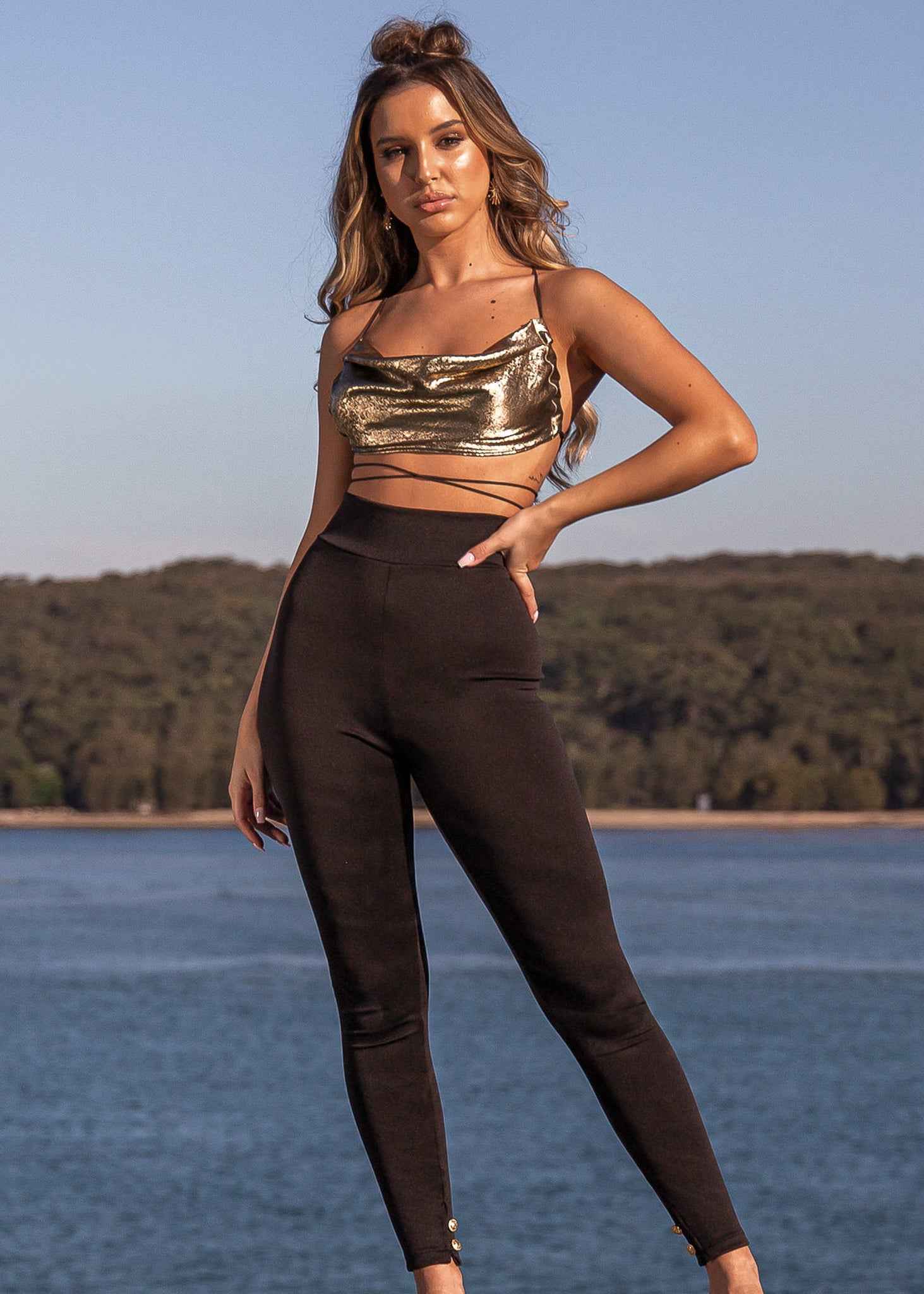 Classic and Contemporary, the Body Luxe Pants will add a refined vibe to your everyday style. These tapered style pants feature an elastic waistband for stretch and comfortability as well as Amy Taylor's signature rear ruching for optimum allure. The ruching & pant cuffs are detailed with gold buttons that make the perfect polished statement.