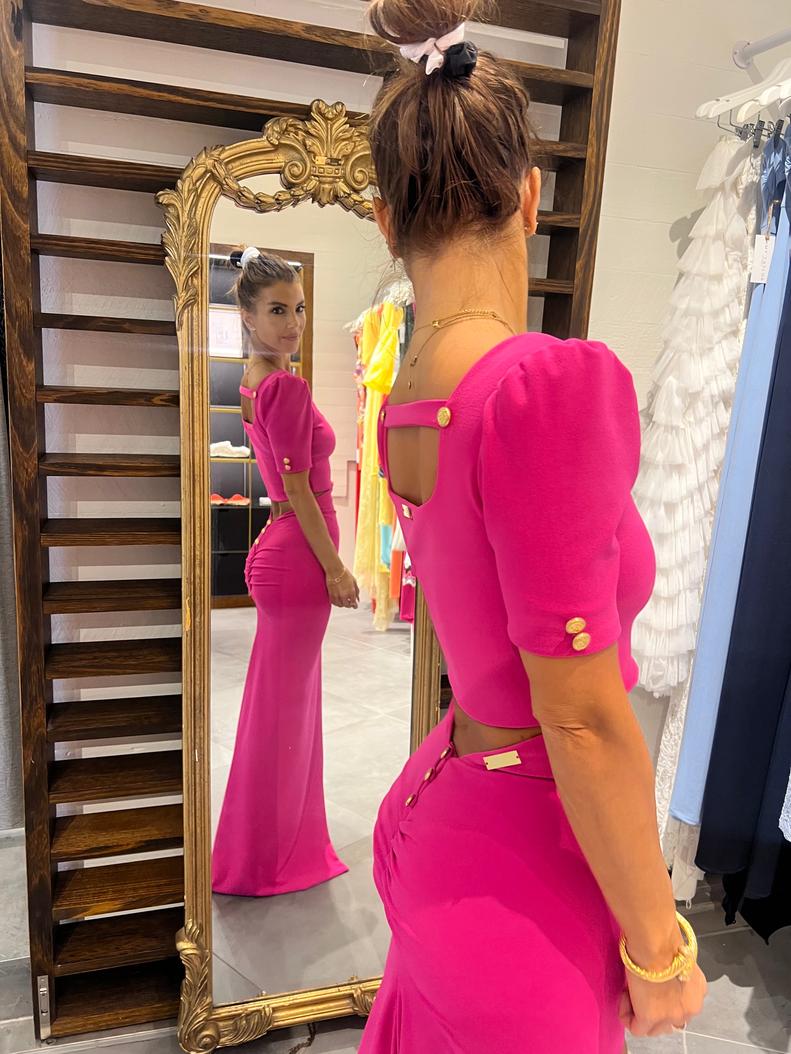 The Carlone Top features short sleeves with gold buttons. A gorgeous back cut-out and it is made from a scuba crepe fabric. Complete the look with the Bella Skirt.