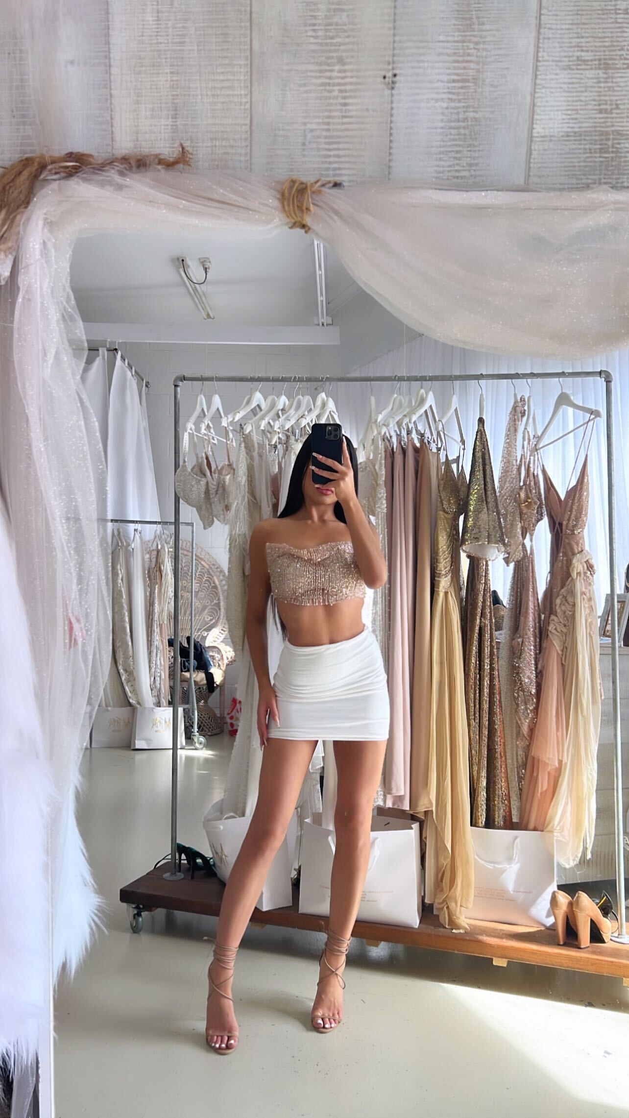 Clasped with a bra strap this bandeau is a tight fit, sure to give you the support you need while you dance the night away. Currently a one of a kind piece, this top is encrusted with hand sewn champagne pearls and a glitter overlay, adding that extra sparkle for your next event.