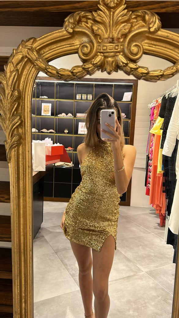 The Golden Hour Mini Dress in a stunning gold hue is the perfect addition to your wardrobe. Designed to be both elegant and versatile, this mini dress will become your go-to piece for any occasion. Whether you're heading to a summer party, a casual brunch, or a night out with friends, this mini dress ensures you shine wherever you go.