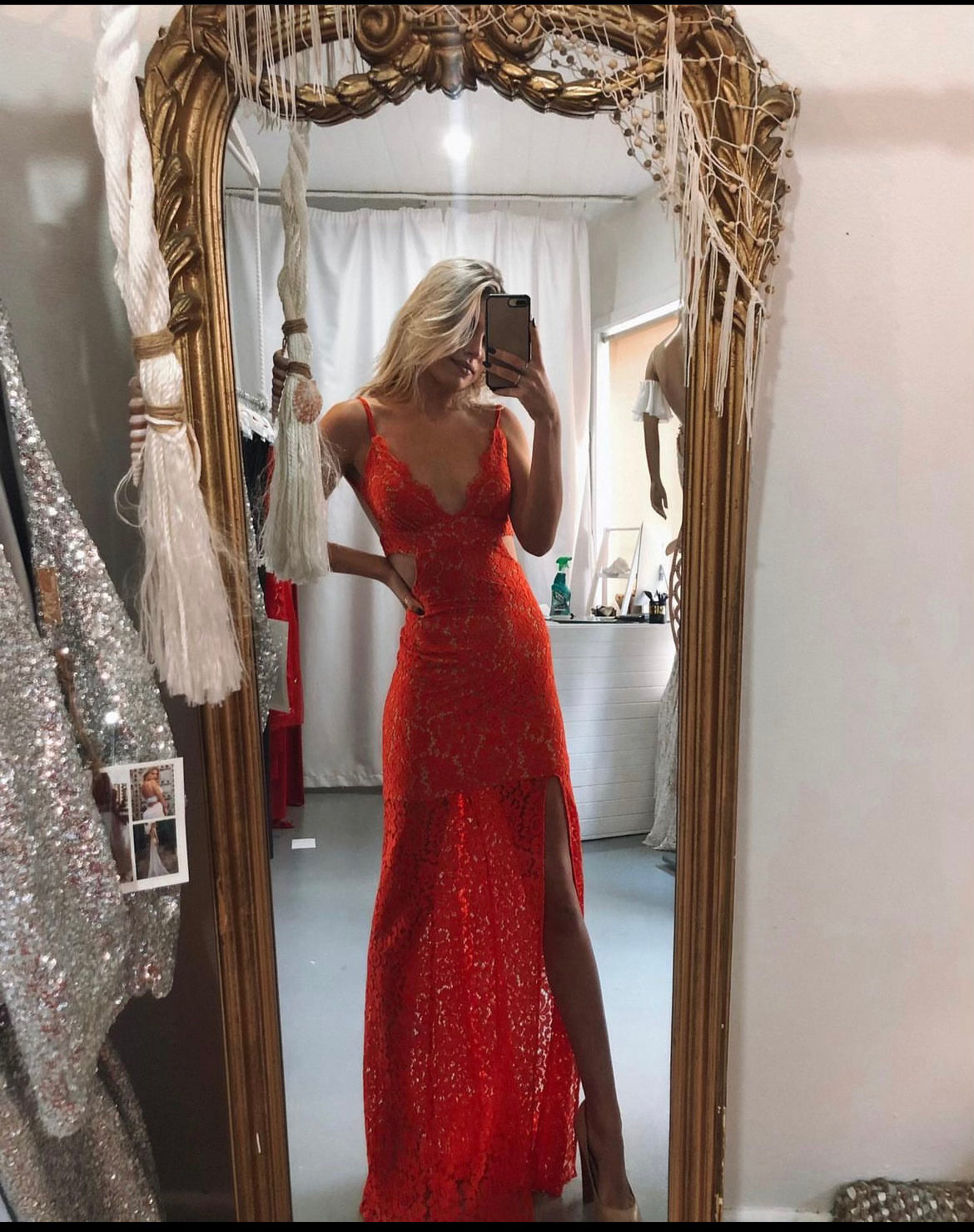 The Red Scarlet Gown is the dress that can be dreamt of. Produced from dreamy lace, the gown embodies a classic triangle bust design with cut outs, showcasing your waist! The open back design with additional back support is decorated by bold gold buttons, lining beneath and a perfectly daring split.