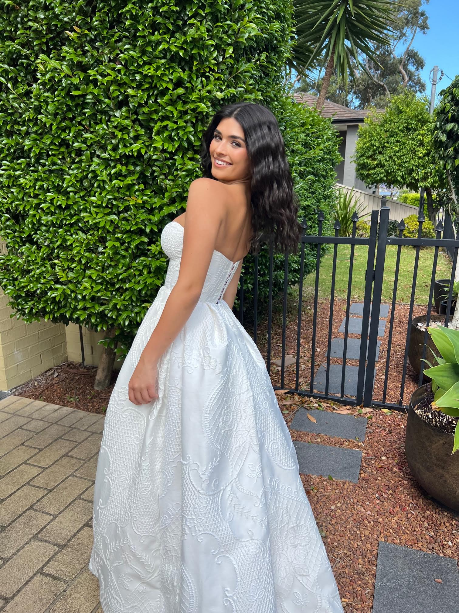 The Toriana Gown is a one of kind piece. With its adjustable lace up back, the gown fits size XS-M. The length is not too long and our model is 170cm tall.